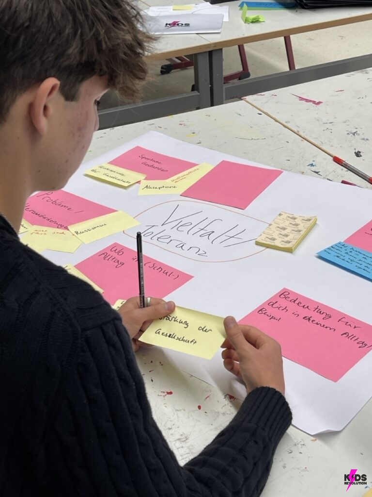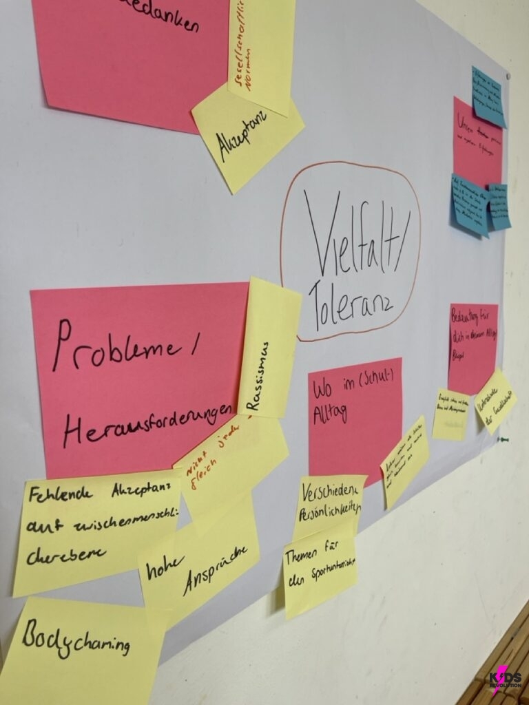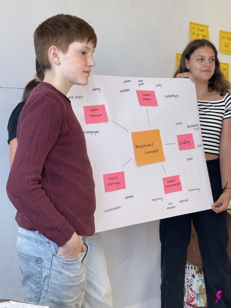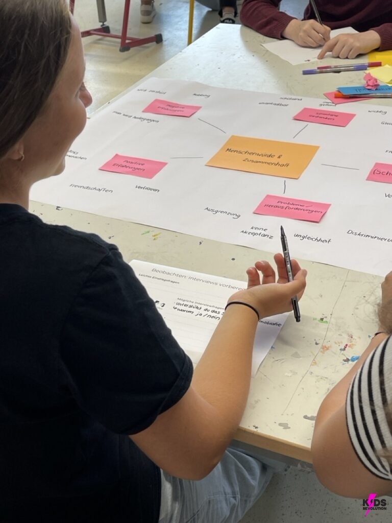 In der Verstehensphase wurden Plakate zu zentralen demokratischen Werten gestaltet, um ein gemeinsames Verständnis im Team zu entwickeln. In der anschließenden Empathiephase, führten die Schüler*innen während der großen Pause Interviews mit Mitschüler*innen und Lehrkräften in dem Schulgebäude, um andere Perspektiven kennen zu lernen. Die gesammelten Antworten wurden anschließend ausgewertet und zentrale Challenges wurden identifiziert, wie z.B.