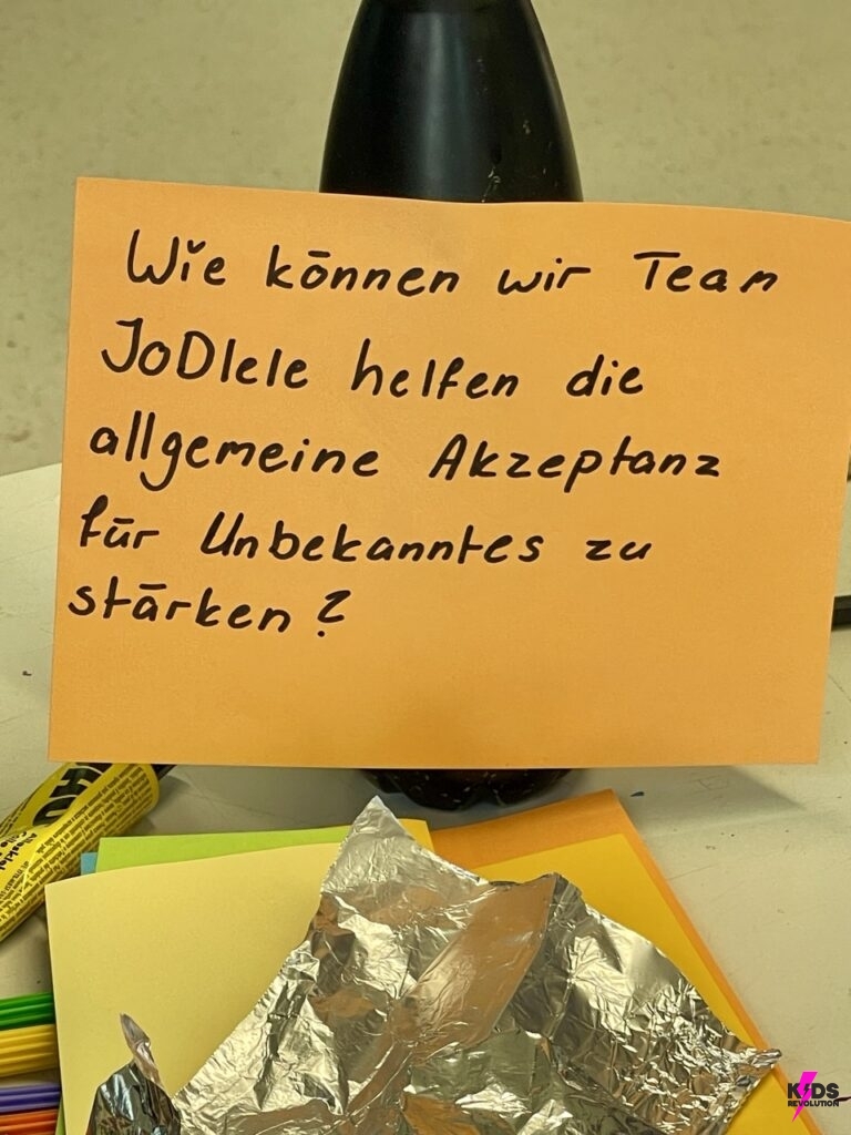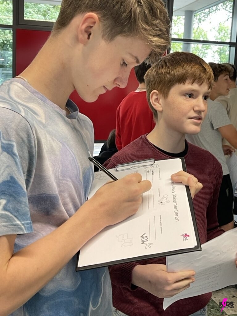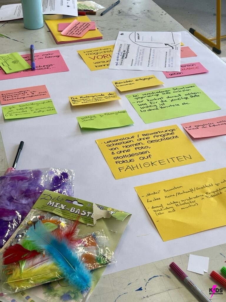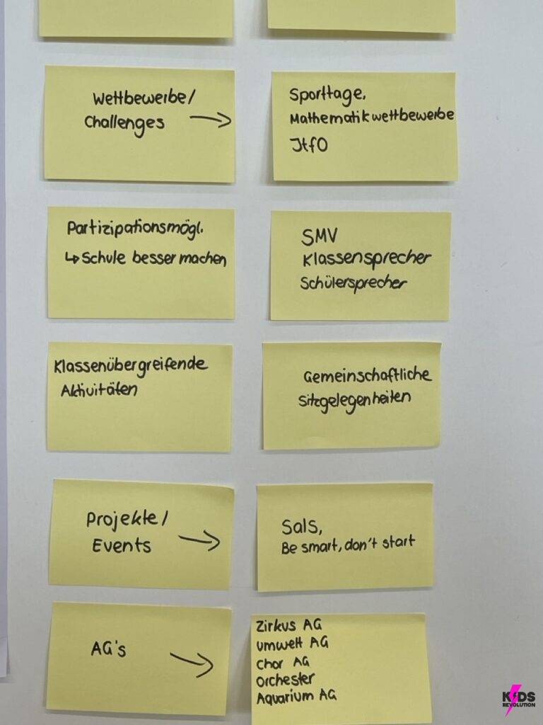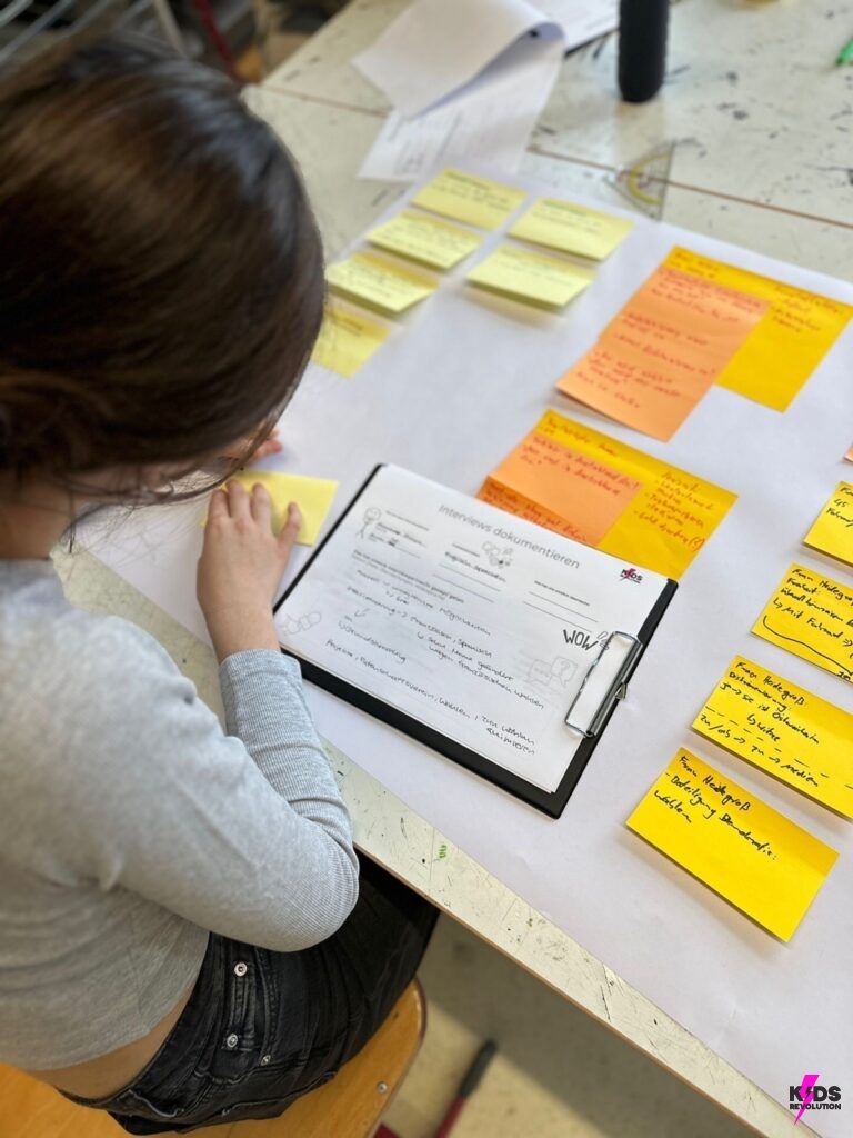 In der Verstehensphase wurden Plakate zu zentralen demokratischen Werten gestaltet, um ein gemeinsames Verständnis im Team zu entwickeln. In der anschließenden Empathiephase, führten die Schüler*innen während der großen Pause Interviews mit Mitschüler*innen und Lehrkräften in dem Schulgebäude, um andere Perspektiven kennen zu lernen. Die gesammelten Antworten wurden anschließend ausgewertet und zentrale Challenges wurden identifiziert, wie z.B.