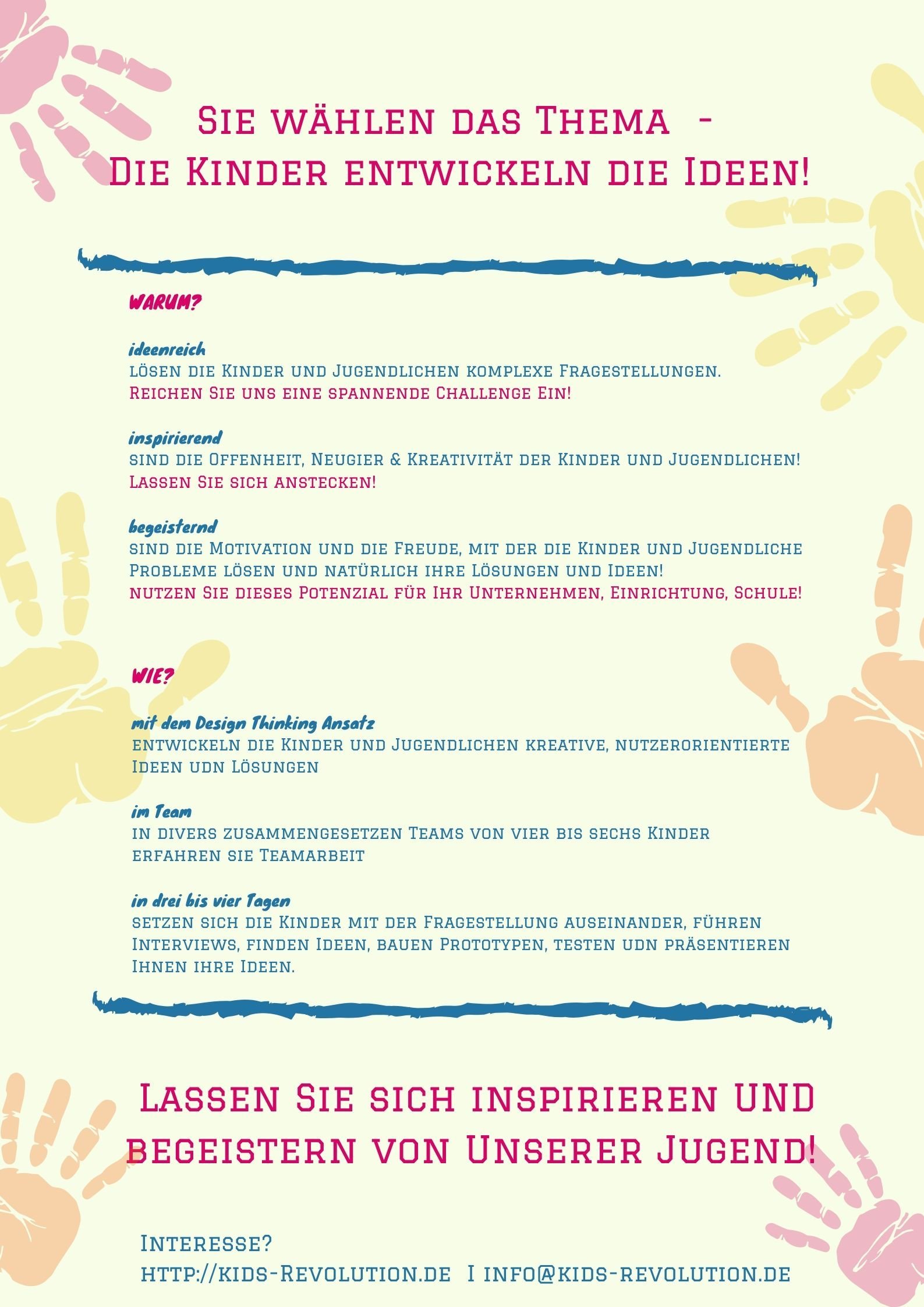 Kinder und Jugendliche sind neugierig, kreativ, mutig und voller Ideen. Mit unseren Innovations- und Beteiligungsformaten geben wir der jungen Generation eine Stimme und Raum und Zeit, ihre Umwelt aktiv mitzugestalten. Wir begleiten Kinder und Jugendliche dabei, eigene Ideen für die Welt von morgen zu entwickeln. Wir fördern Mutanfälle! Kids Revolution ist eine Initiative der Stell dir vor! gGmbH.