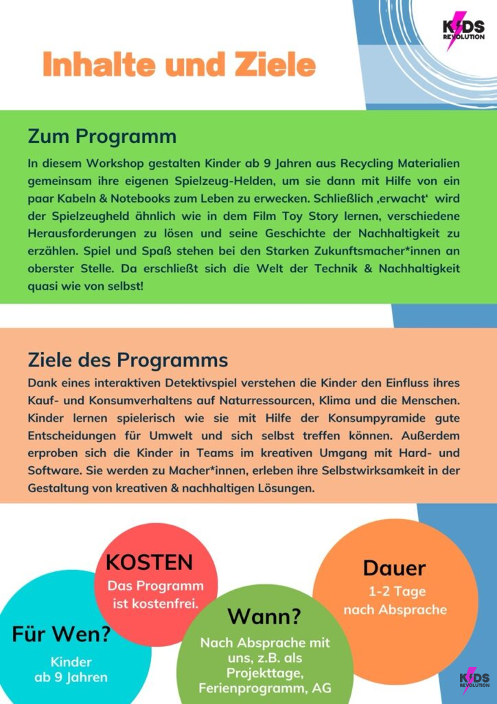 In diesem Workshop gestalten Kinder ab 9 Jahren aus Recycling Materialien gemeinsam ihre eigenen Spielzeug-Helden, um sie dann mit Hilfe von ein paar Kabeln & Notebooks zum Leben zu erwecken. Schließlich ‚erwacht‘wird der Spielzeugheld ähnlich wie in dem Film Toy Story lernen, verschiedene Herausforderungen zu lösen und seine Geschichte der Nachhaltigkeit zu erzählen. Spiel und Spaß stehen bei den Starken Zukunftsmacher*innen an oberster Stelle. Da erschließt sich die Welt der Technik & Nachhaltigkeit quasi wie von selbst!