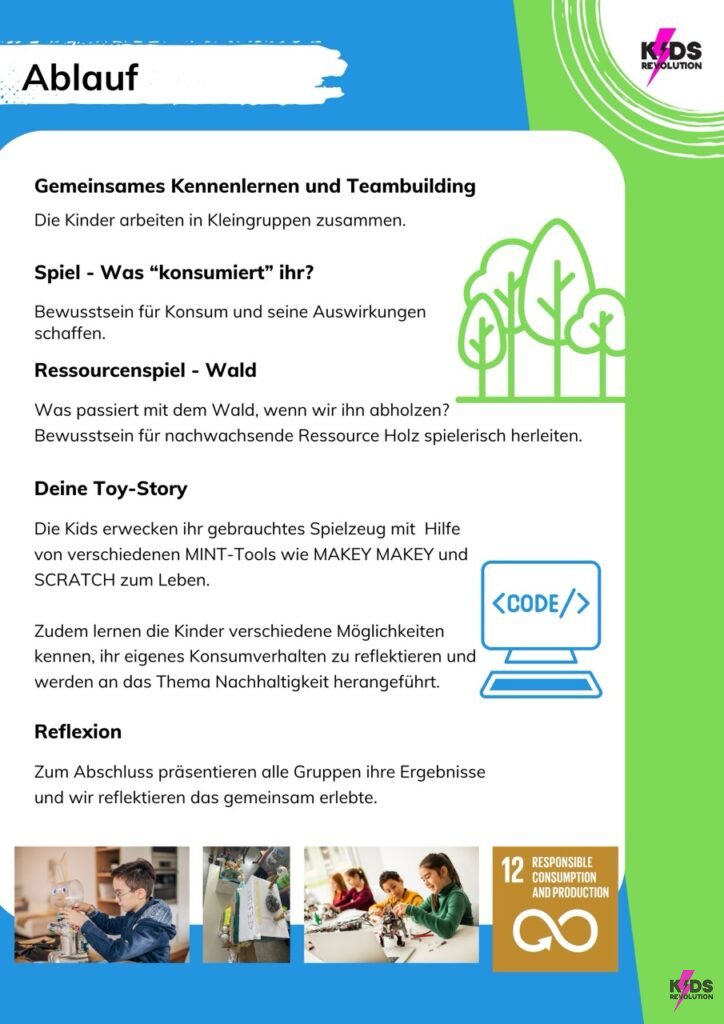 Dank eines interaktiven Detektivspiel verstehen die Kinder den Einfluss ihres Kauf- und Konsumverhaltens auf Naturressourcen, Klima und die Menschen. Kinder lernen spielerisch wie sie mit Hilfe der Konsumpyramide gute Entscheidungen für Umwelt und sich selbst treffen können. Außerdem erproben sich die Kinder in Teams im kreativen Umgang mit Hard- und Software. Sie werden zu Macher*innen, erleben ihre Selbstwirksamkeit in der Gestaltung von kreativen & nachhaltigen Lösungen.